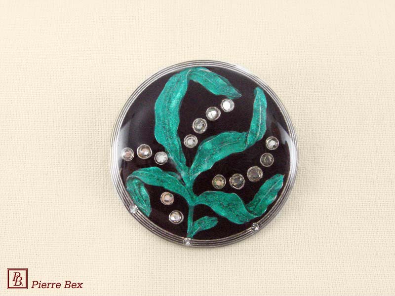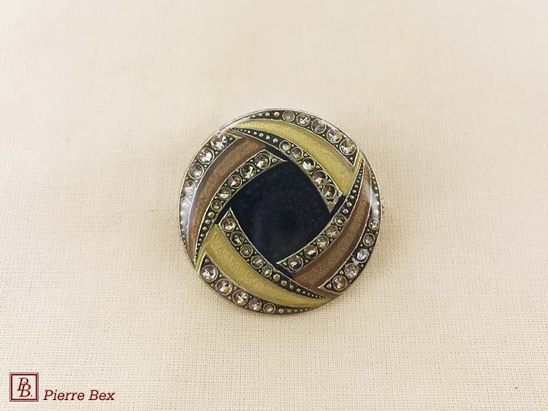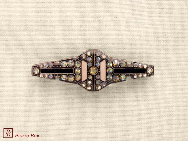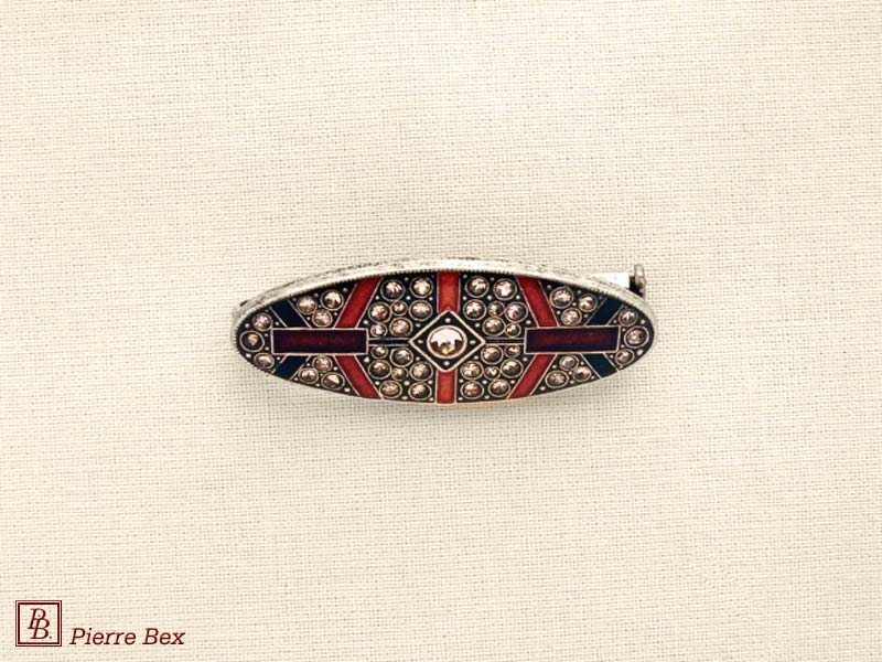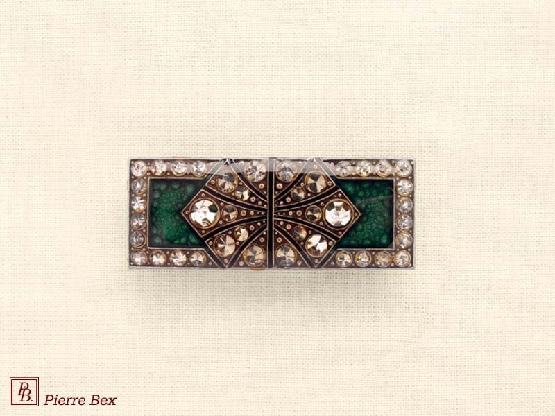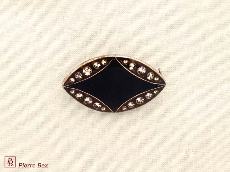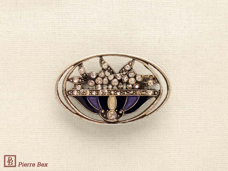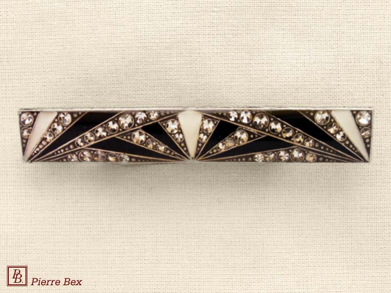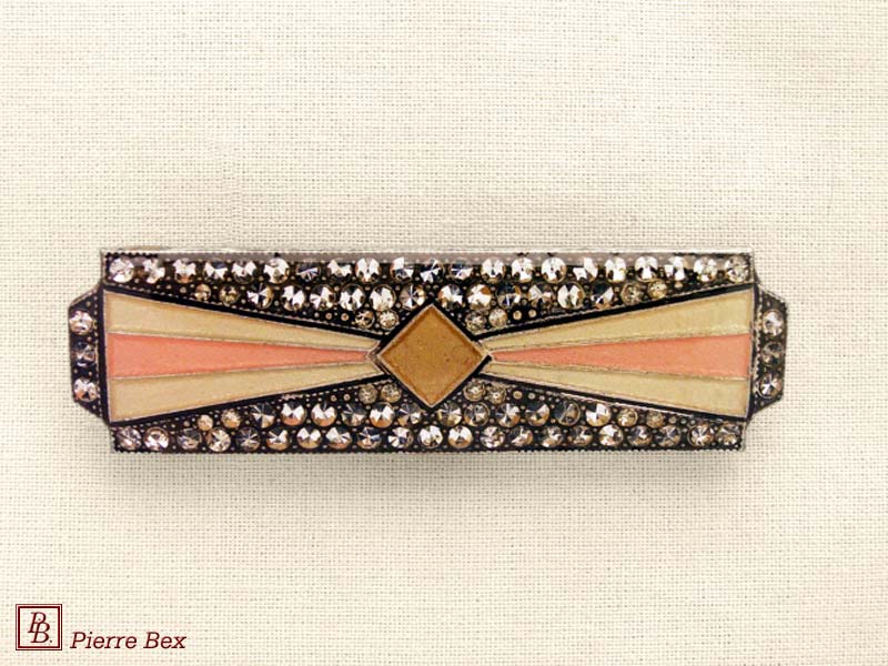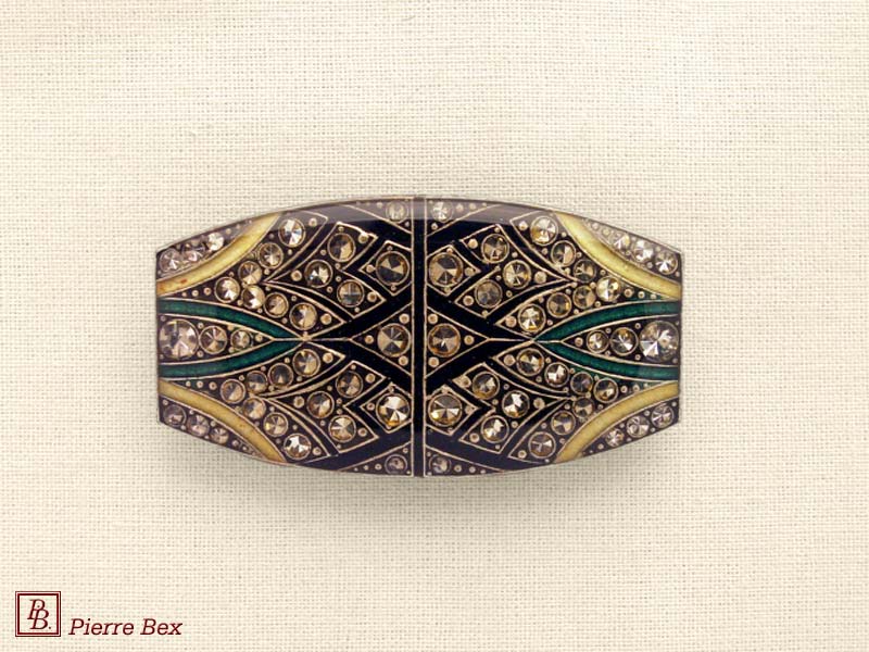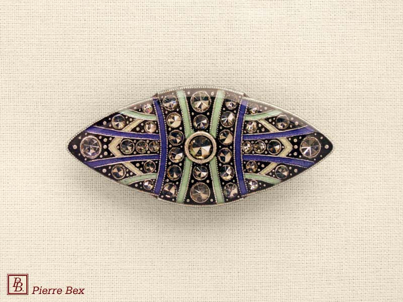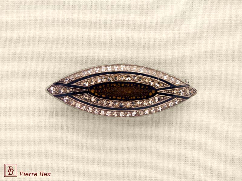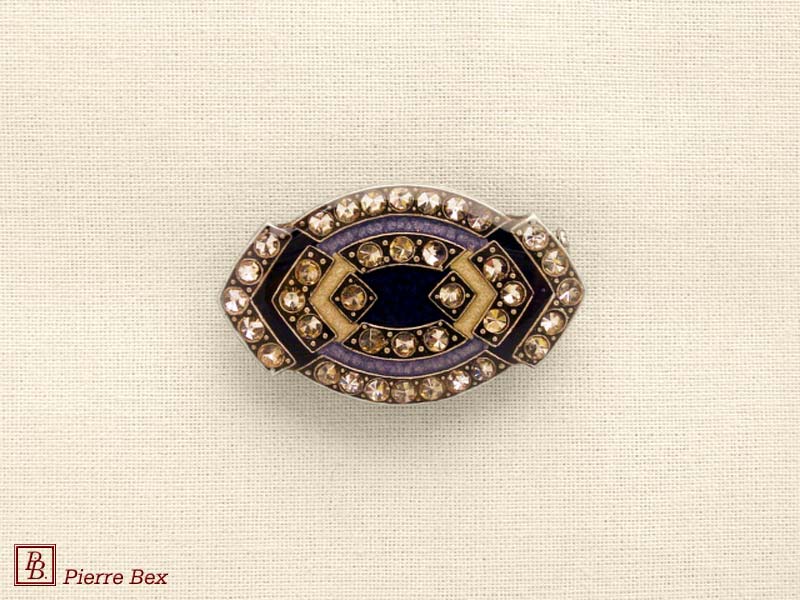 ![]() Art-Deco brooch 49506-03Sold OutMade by Pierre-Bex from silverplated copper, rhinestones and enamel, this brooch is 4 cm ( 1-½ inch ) width. Sold Out |