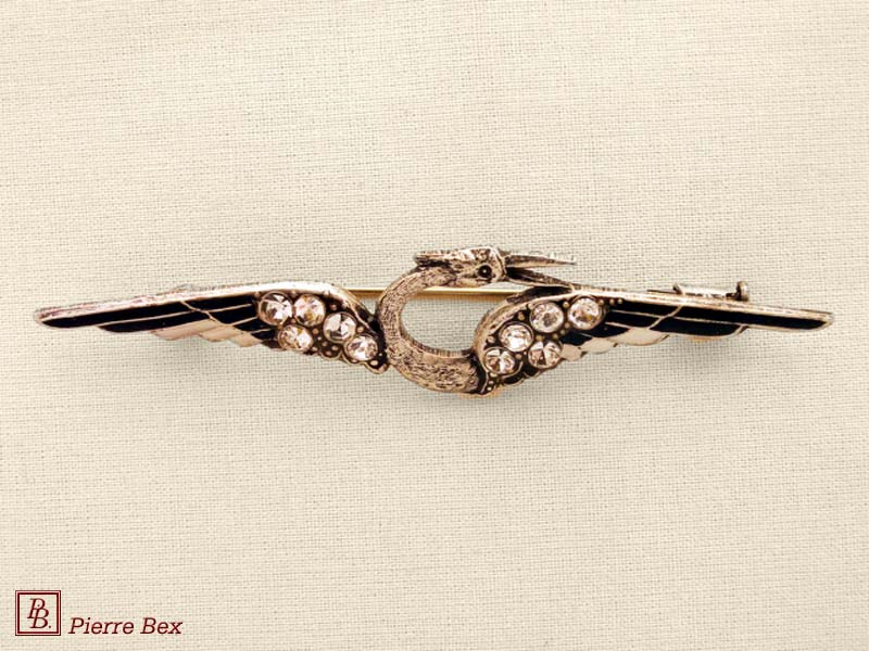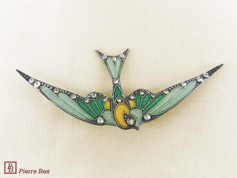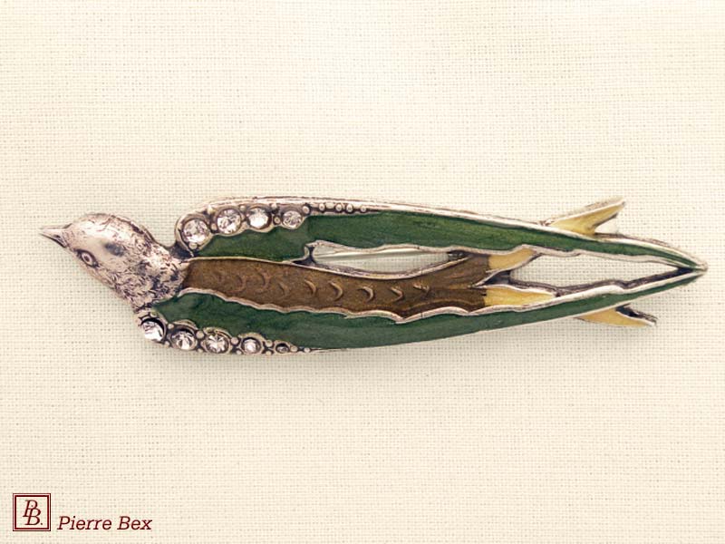 ![]() Art-Deco brooch swallow 49506-40USD 35.00![]() Made by Pierre-Bex from silverplated copper, rhinestones and enamel, this brooch is 8 cm ( 3 inches ) width. USD 35.00 |