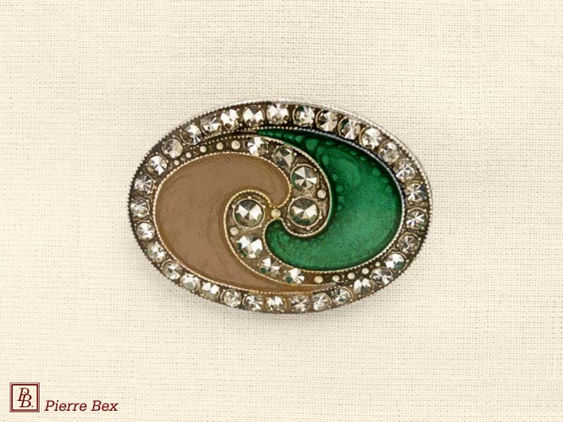 ![]() Art-Deco brooch 49506-33Sold OutMade by Pierre-Bex from silverplated copper, rhinestones and enamel, this brooch is 4 cm ( 1-½ inch ) width. Sold Out |