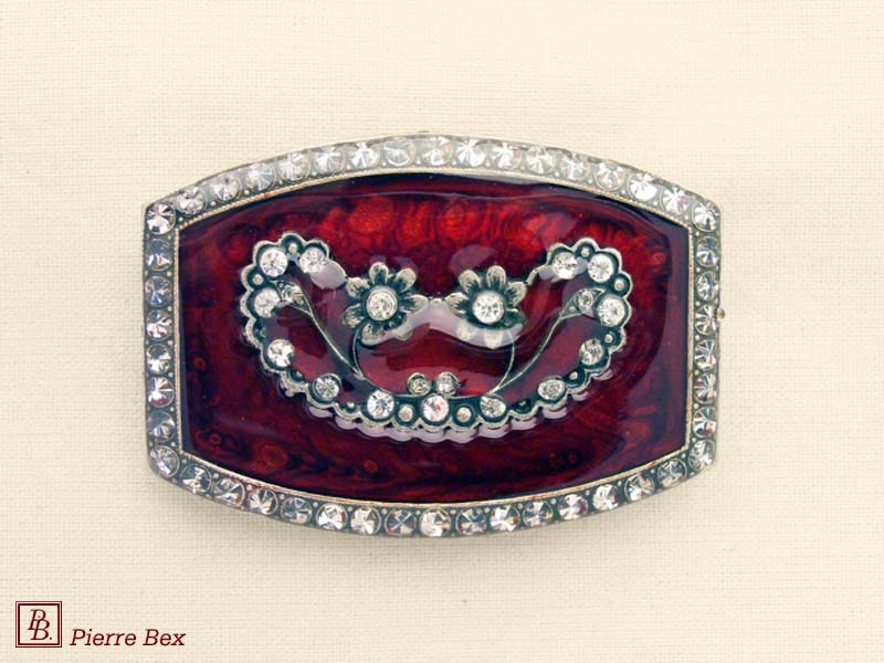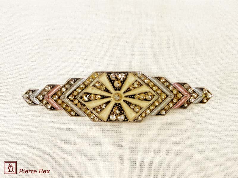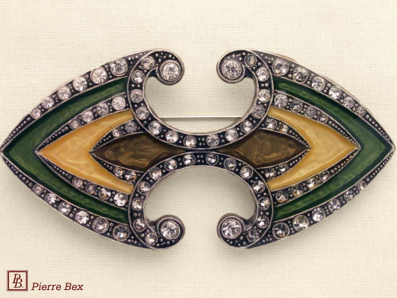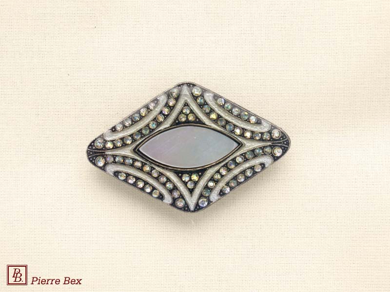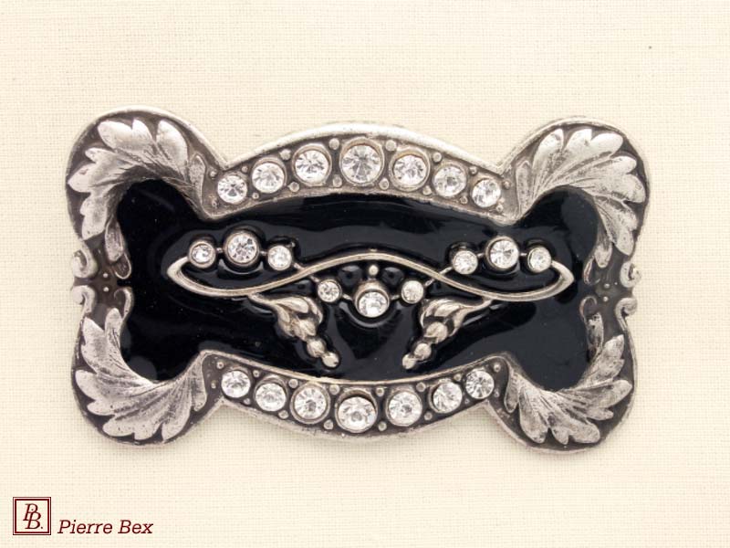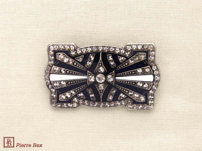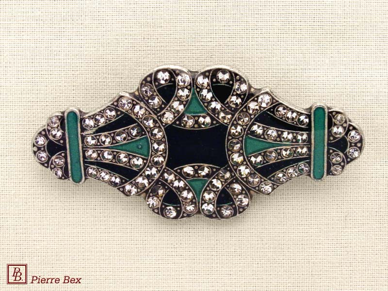 ![]() Art-Deco brooch 46686-02Sold OutMade by Pierre-Bex from silverplated copper, rhinestones and enamel, this brooch is 4.5 cm ( 1-½ inch ) width. Sold Out |