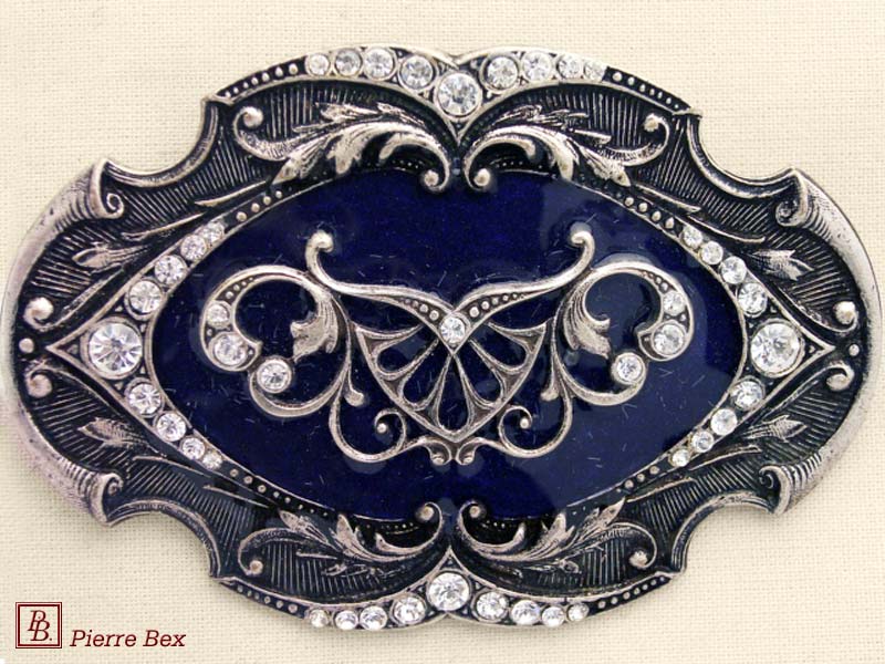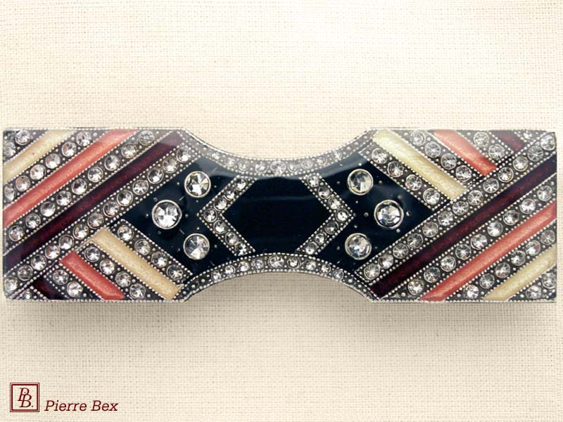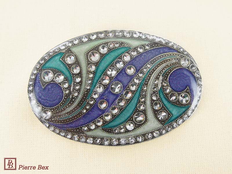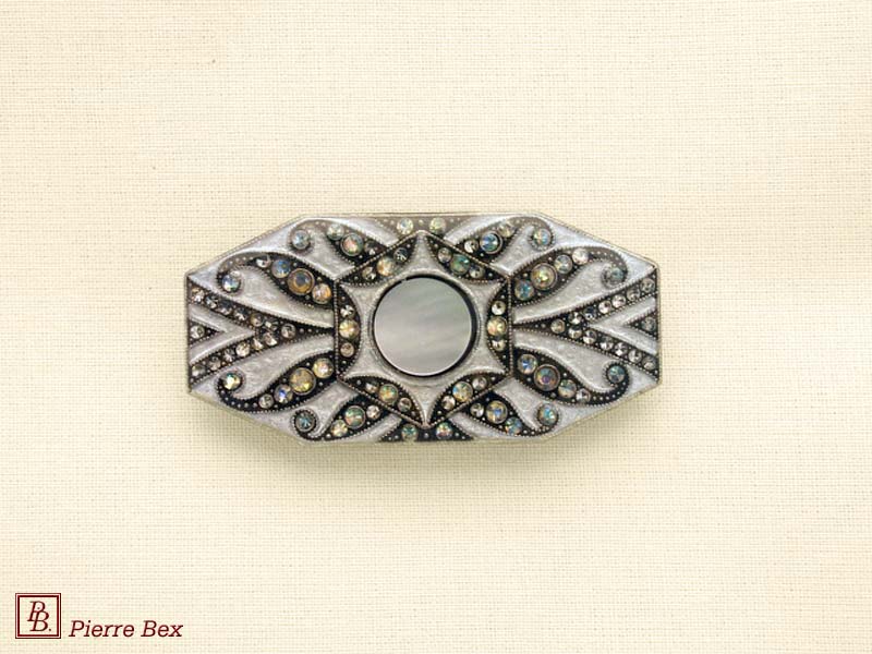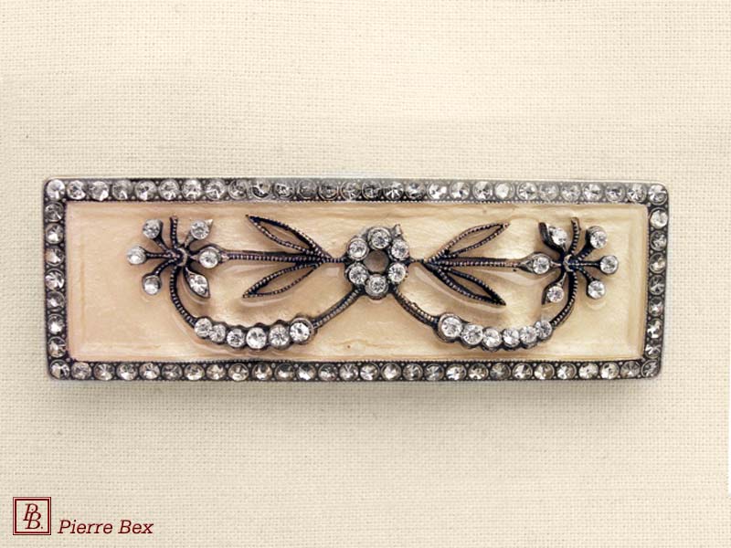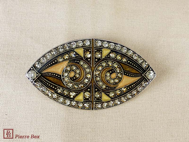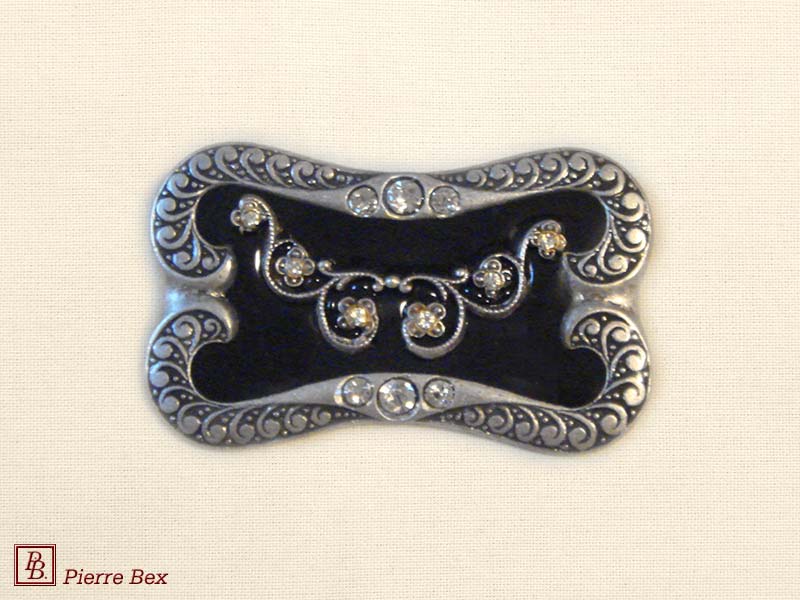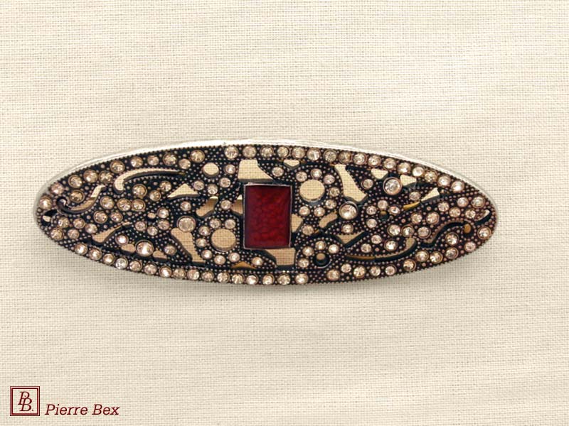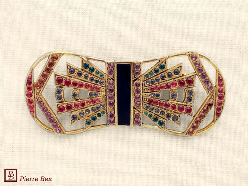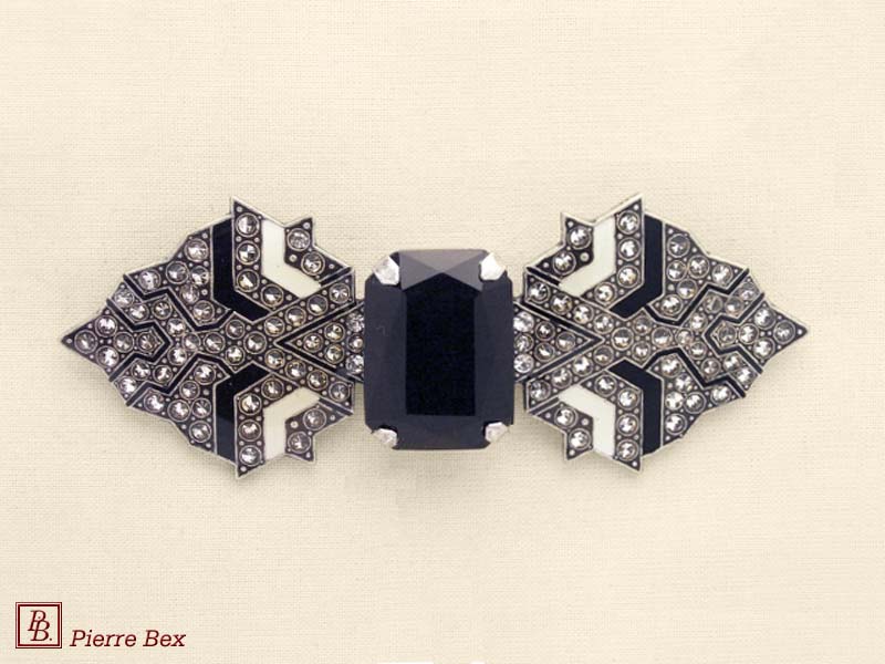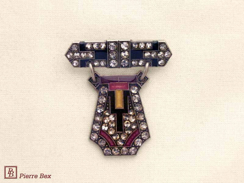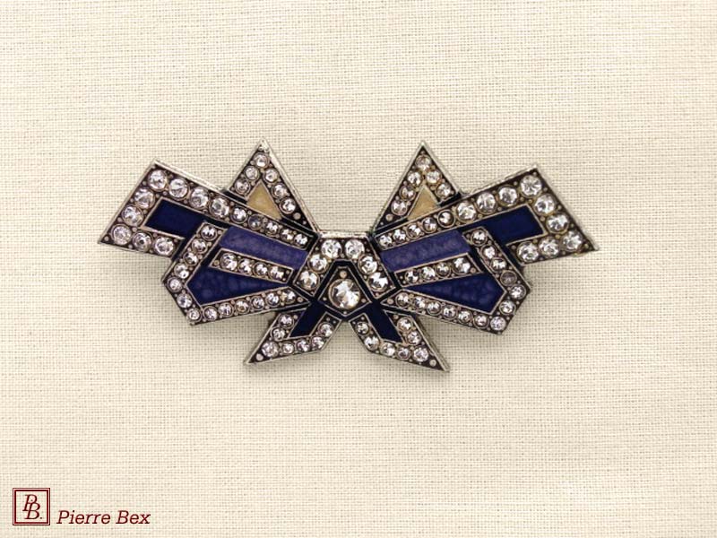 ![]() Art-Deco X. large brooch 49576-02Sold OutMade by Pierre-Bex from silverplated copper, rhinestones and enamel, this brooch is 10 cm ( 4 inches ) width. Sold Out |
