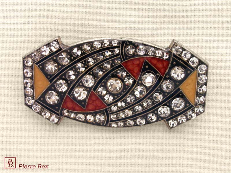 ![]() Art-Deco brooch 46696-10Sold OutMade by Pierre-Bex from silverplated copper, rhinestones and enamel, this brooch is 4.5 cm ( 1-½ inch ) width. Sold Out |