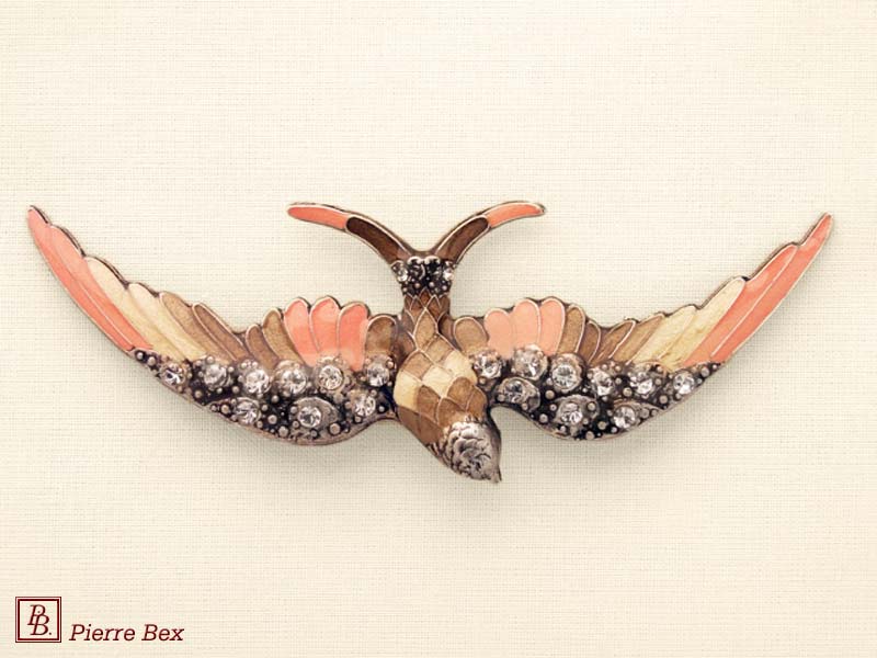 ![]() Art-Deco large brooch swallow 49566-35Sold OutMade by Pierre-Bex from silverplated copper, rhinestones and enamel, this brooch is 10 cm ( 4 inches ) width. Sold Out |