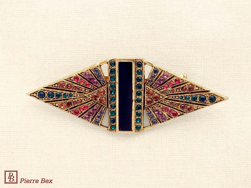![]() Art-Deco large brooch 49566-12Sold OutMade by Pierre-Bex from goldplated copper, rhinestones and enamel, this brooch is 6.5 cm ( 2-½ inches ) width. Sold Out |