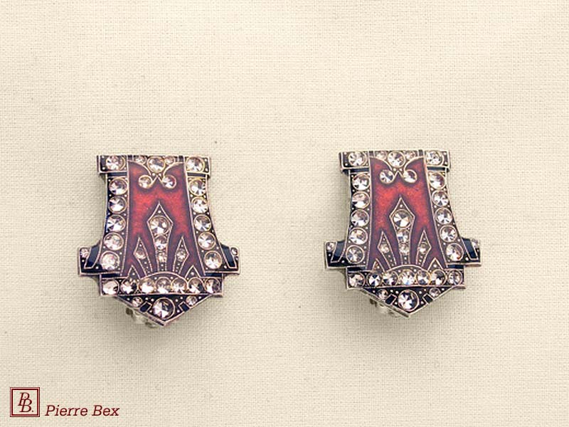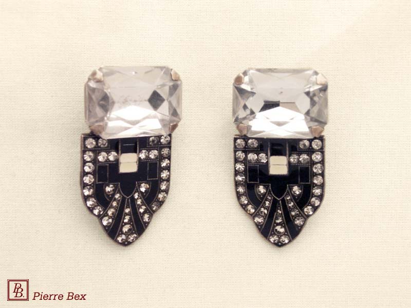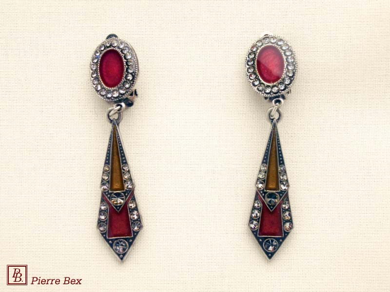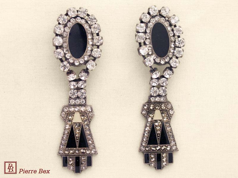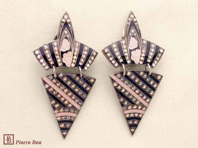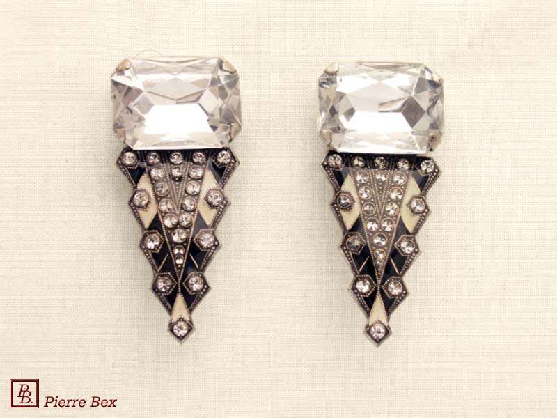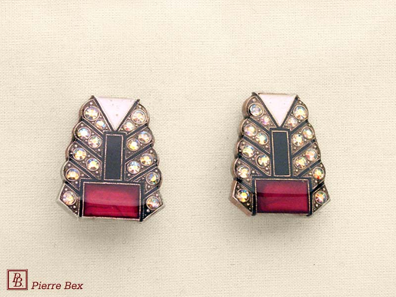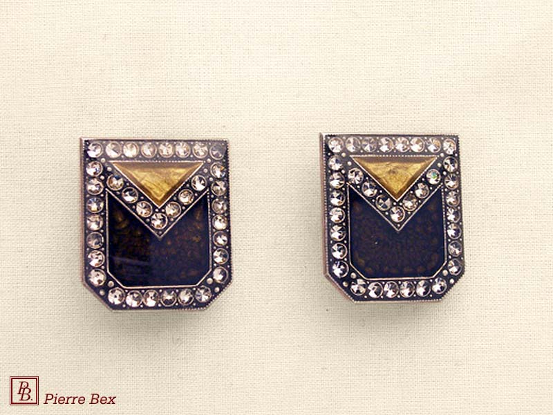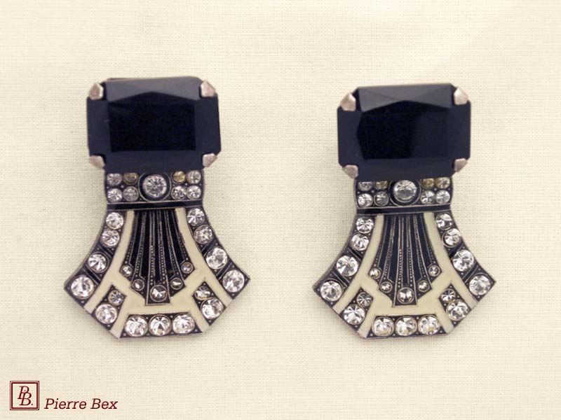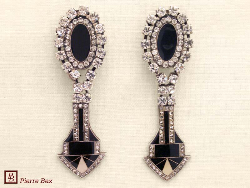 ![]() Art-Deco earclips 49355-20Sold OutMade by Pierre-Bex from silverplated copper, rhinestones and enamel, the length of these earclips is 5 cm ( 2 inches ). Sold Out |