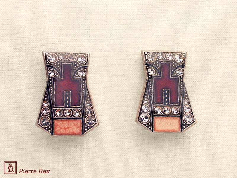 ![]() Art-Deco enameled earclips 46655-02Sold OutMade by Pierre-Bex from silverplated copper, enameled and rhinestones, the length of these earclips is 2.5 cm ( 1 inch ). Sold Out |