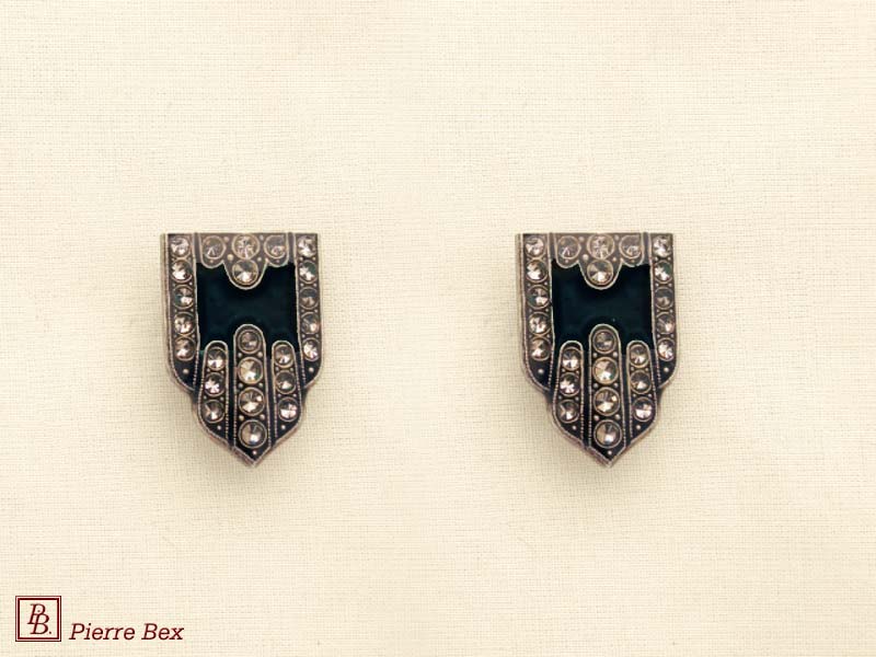![]() Art-Deco earclips 49355-04Sold OutMade by Pierre-Bex from silverplated copper, rhinestones and enamel, the length of these earclips is 5 cm ( 2 inches ). Sold Out |