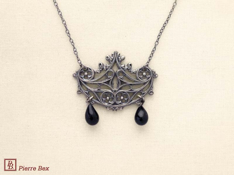 ![]() Art-Nouveau necklace 41514-03Sold OutMade by Pierre-Bex from silverplated copper with a black glass bead, this necklace is 3.5 cm ( 1-½ inch ) width. the length of the chain is 36 cm ( 14 inches ). Sold Out |