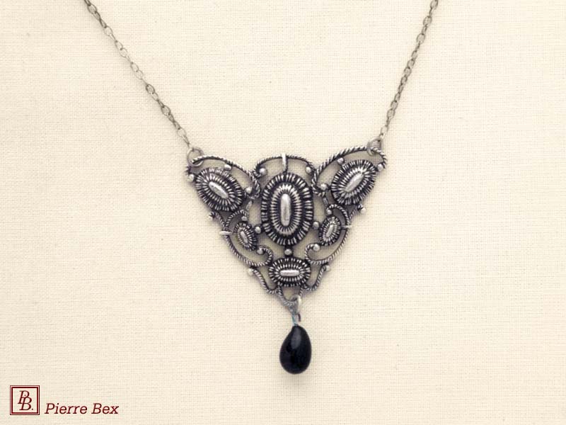 ![]() Art-Nouveau necklace 41514-01Sold OutMade by Pierre-Bex from silverplated copper with a black glass bead, this necklace is 3.5 cm ( 1-½ inch ) width. the length of the chain is 36 cm ( 14 inches ). Sold Out |