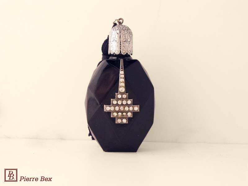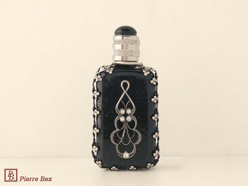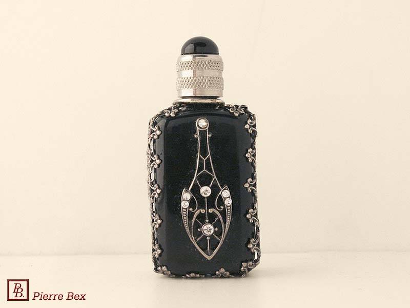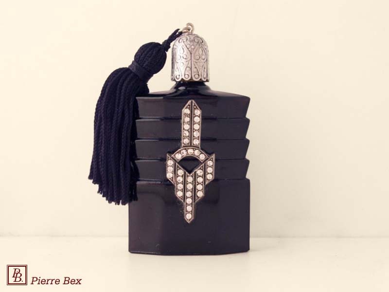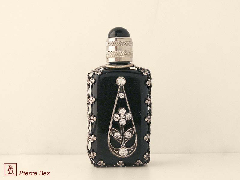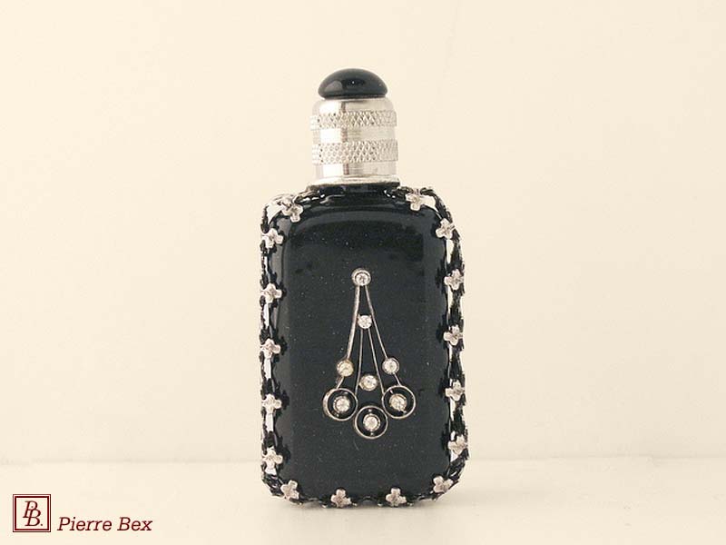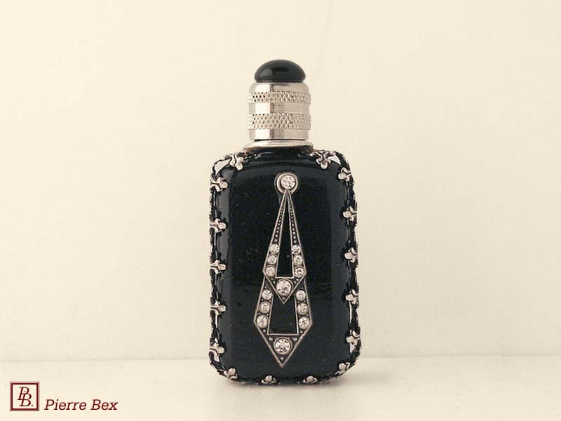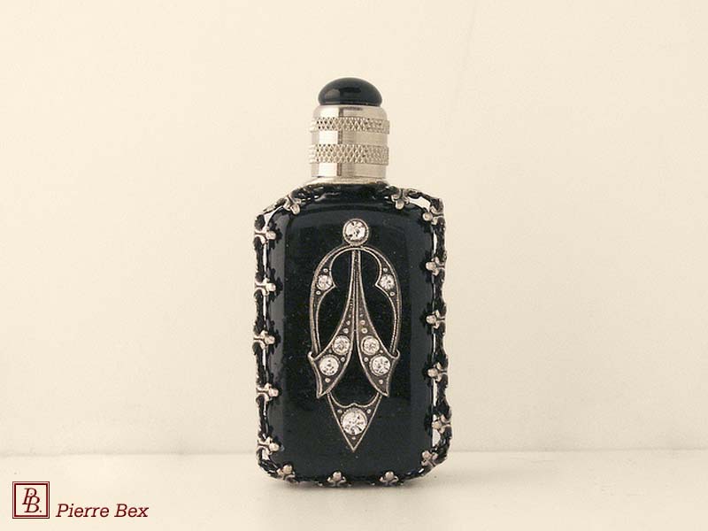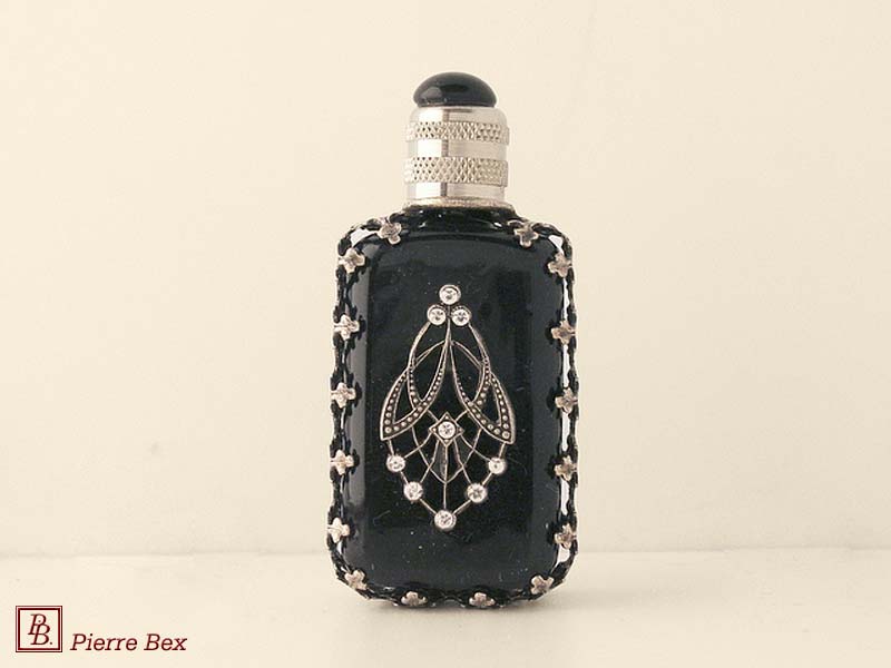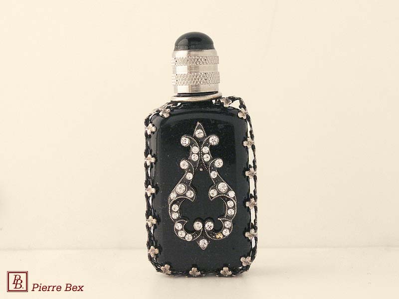 ![]() Art-Deco glass perfume bottle 46199-15Sold OutMade by Pierre-Bex from black glass and silverplated copper with crystal rhinestones, this bottle is 6 cm ( 2-½ inches ) height. Sold Out |