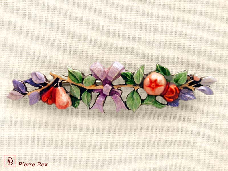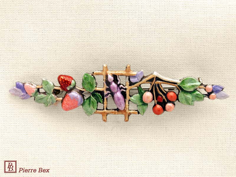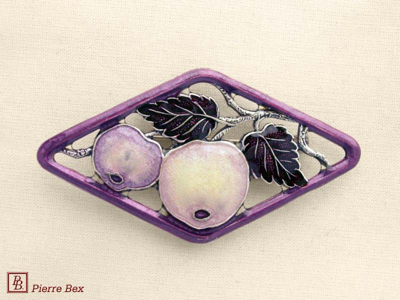 ![]() Art-Deco enameled brooch apples 48546-05Sold OutMade by Pierre-Bex from enameled silverplated copper, this brooch is 6.5 cm ( 2-½ inches ) width. Sold Out |