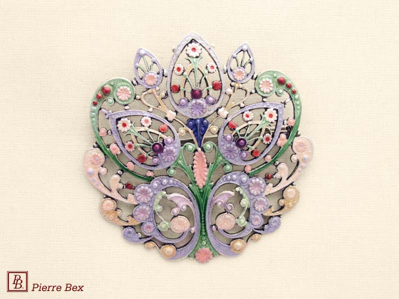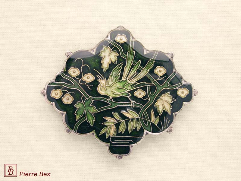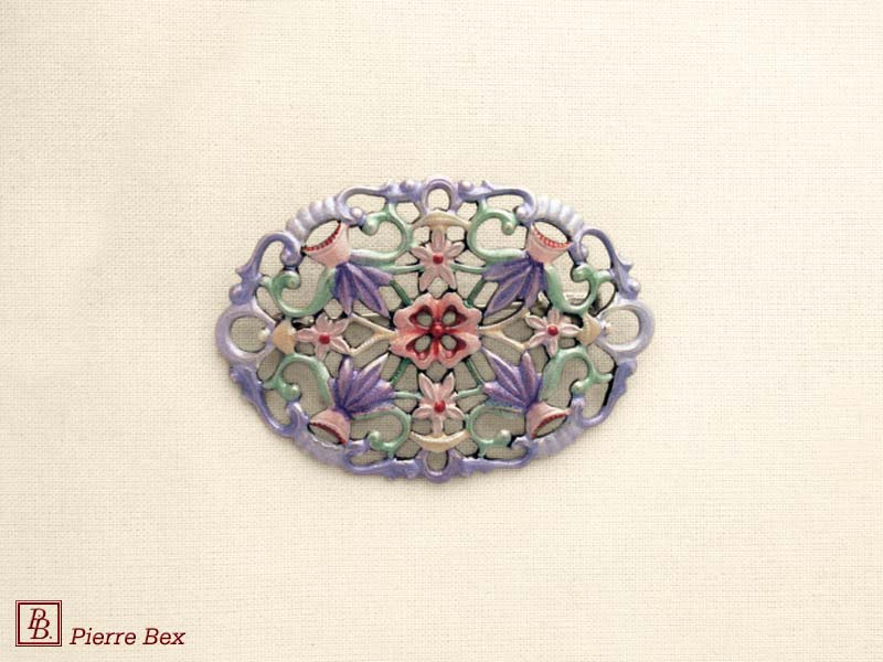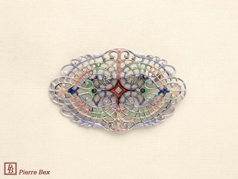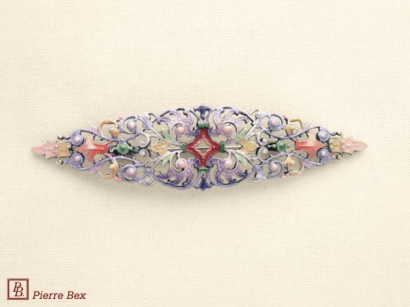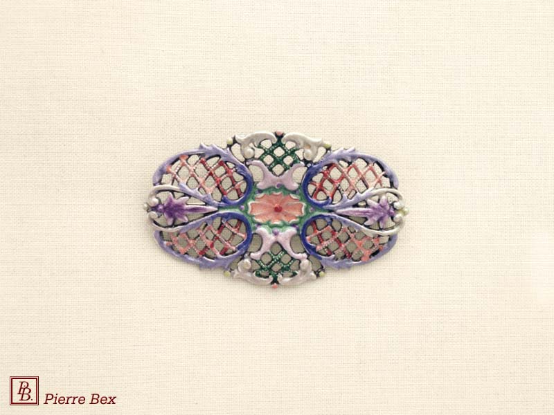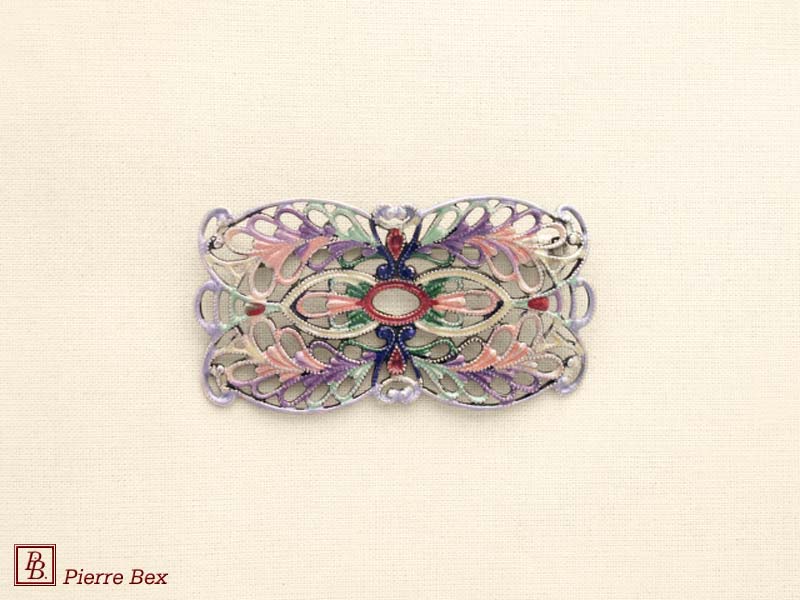 ![]() Art-Nouveau enameled brooch filigree 48266-04Sold OutMade by Pierre-Bex from enameled silverplated copper, this brooch is 5 cm ( 2 inches ) width. Sold Out |