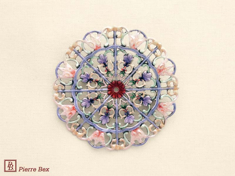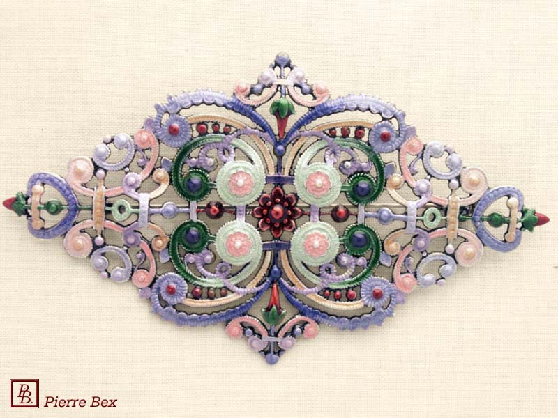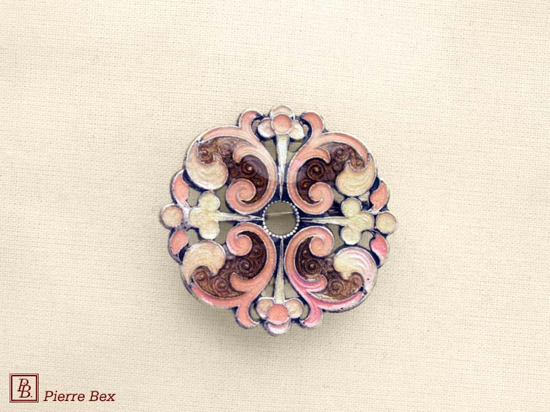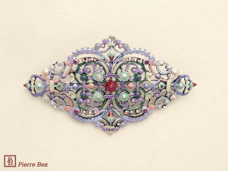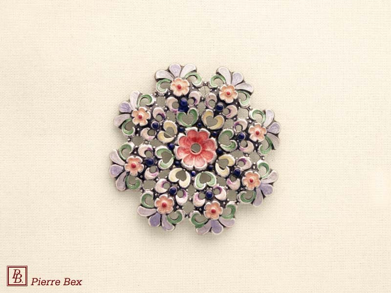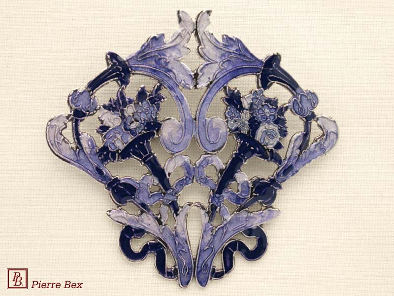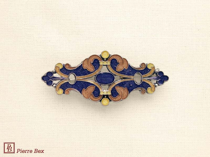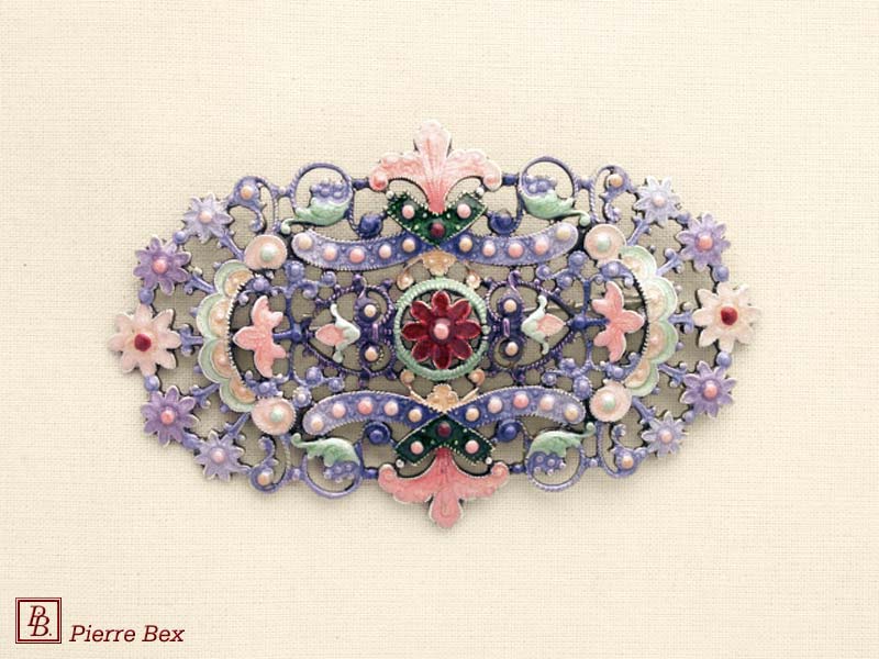 ![]() Art-Nouveau enameled brooch filigree 48266-04Sold OutMade by Pierre-Bex from enameled silverplated copper, this brooch is 5 cm ( 2 inches ) width. Sold Out |
