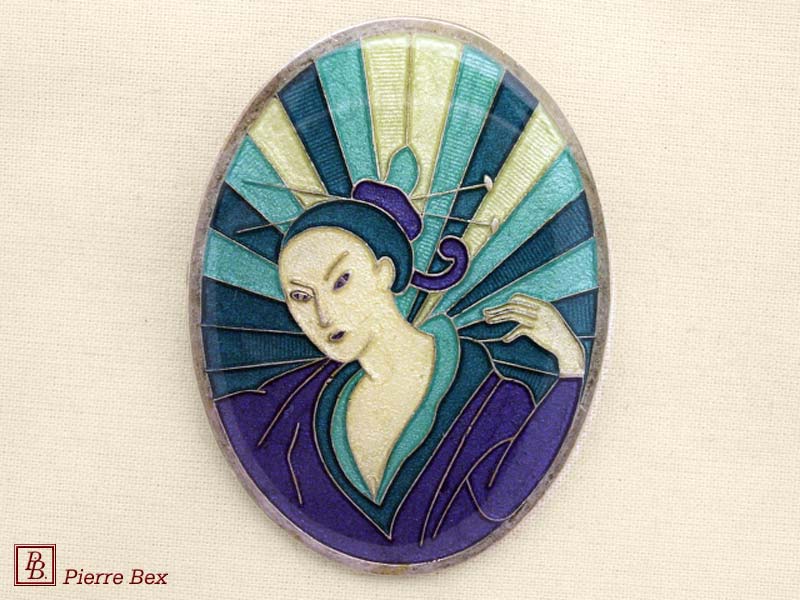 ![]() Art-Deco enameled brooch 48536-26Sold OutMade by Pierre-Bex from enameled silverplated copper, this brooch is 7 cm ( 2-½ inches ) width. Sold Out |