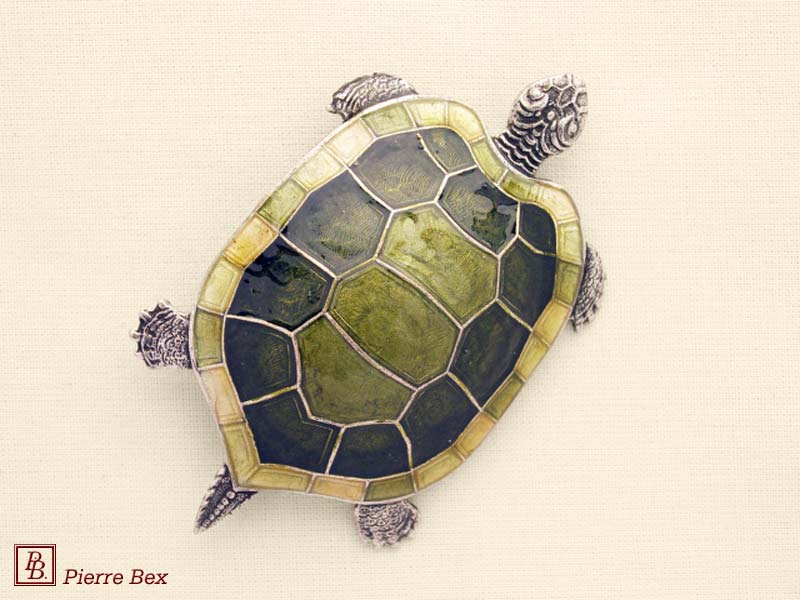 ![]() Art-Deco large enameled brooch turtle 48566-12Sold OutMade by Pierre-Bex from enameled silverplated copper, this brooch is 6.5 cm ( 2-½ inches ) width. Sold Out |