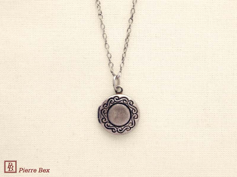 Sold OutMade by Pierre-Bex from silverplated copper, this round locket is 2.5 cm ( 1 inch ) height. You may open it to place a picture. the length of the chain is 45 cm ( 18 inches ). Sold Out |