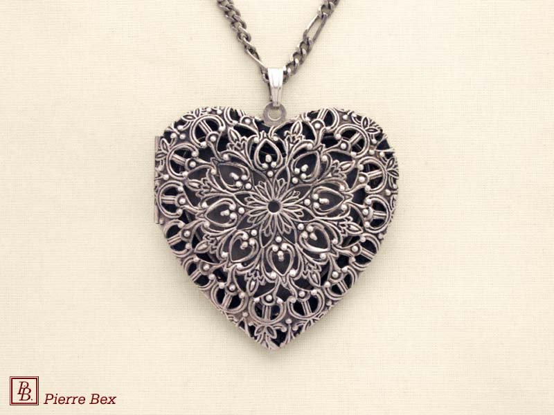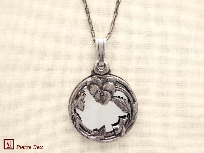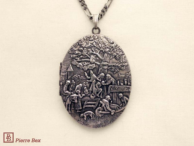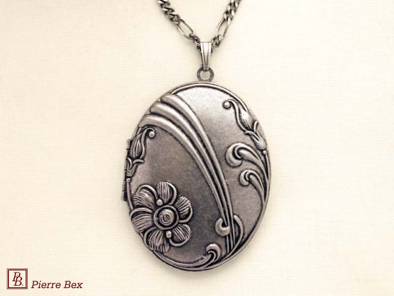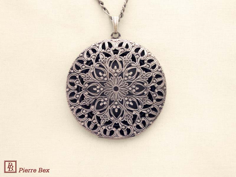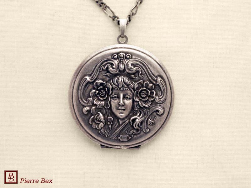 Sold OutMade by Pierre-Bex from silverplated copper, this locket is 5 cm ( 2 inches ) height. You may open it to place a picture or a piece of hair. the length of the chain is 70 cm ( 27 inches ). Sold Out |