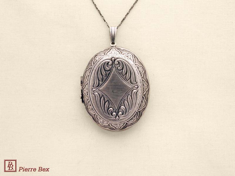 USD 40.00 Made by Pierre-Bex from silverplated copper, this locket is 7.5 cm ( 3 inches ) height. You may open it to place a picture or a piece of hair. the length of the chain is 70 cm ( 27 inches ). USD 40.00 |