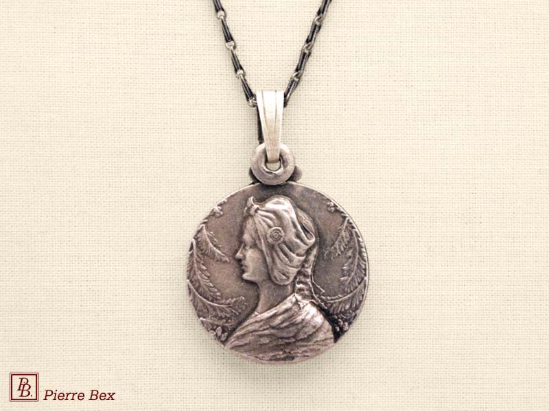 USD 40.00 Made by Pierre-Bex from silverplated copper, this locket is 6 cm ( 2-½ inches ) height. You may open it to place a picture or a piece of hair. the length of the chain is 70 cm ( 27 inches ). USD 40.00 |