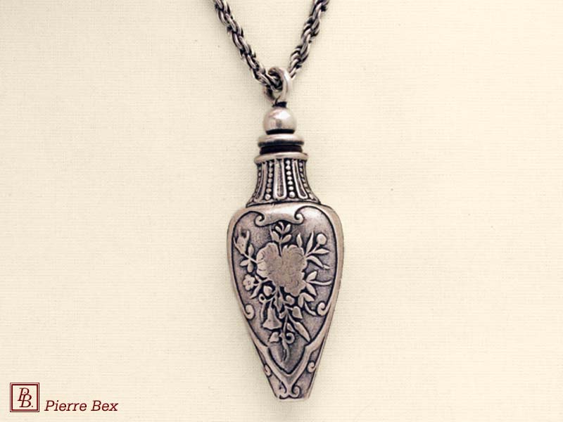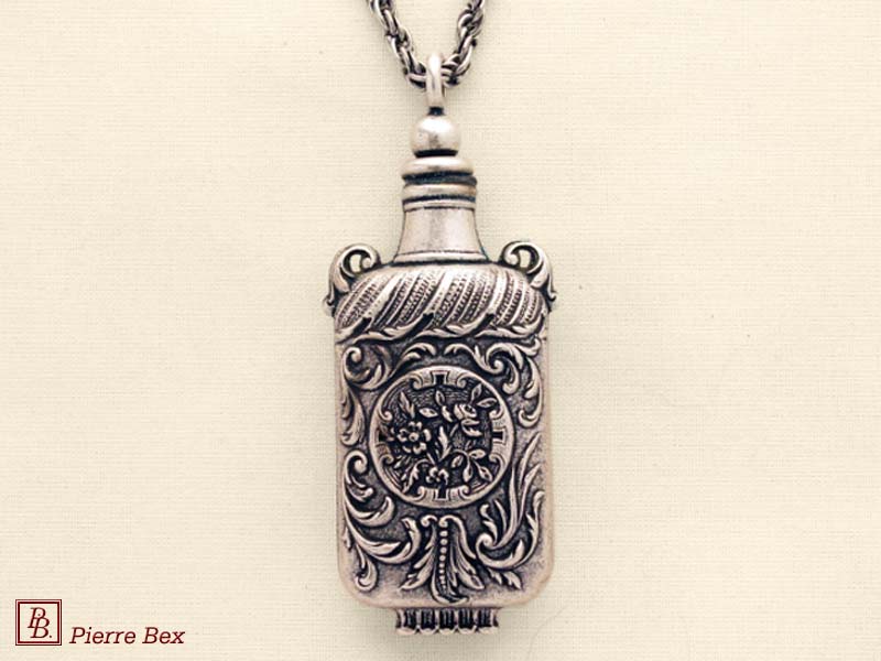 Sold OutMade by Pierre-Bex from silverplated copper, this bottle is 6.5 cm ( 2-½ inches ) height. the length of this chain is 70 cm ( 27 inches ). Sold Out |