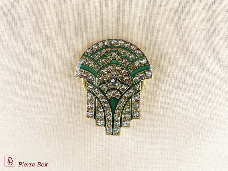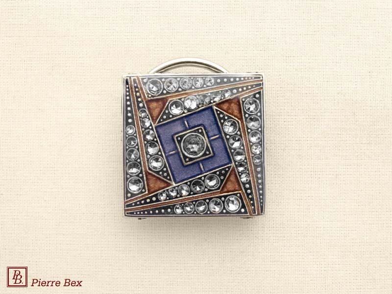 Sold OutMade by Pierre-Bex from silverplated copper, rhinestones and enamel, this scarf clip is 3.5 cm ( 1-½ inch ) width. Sold Out |