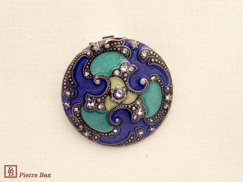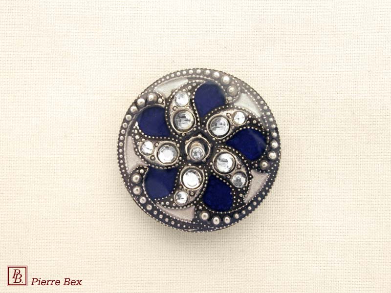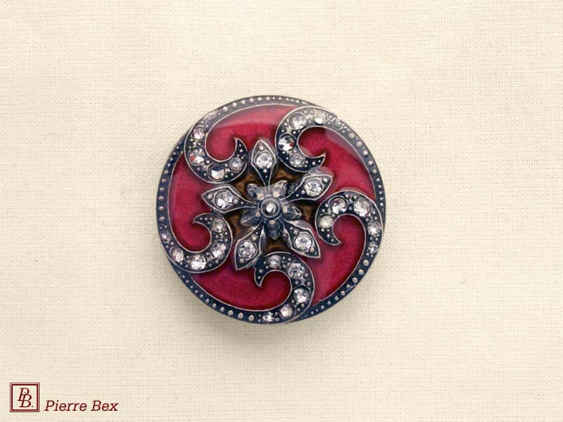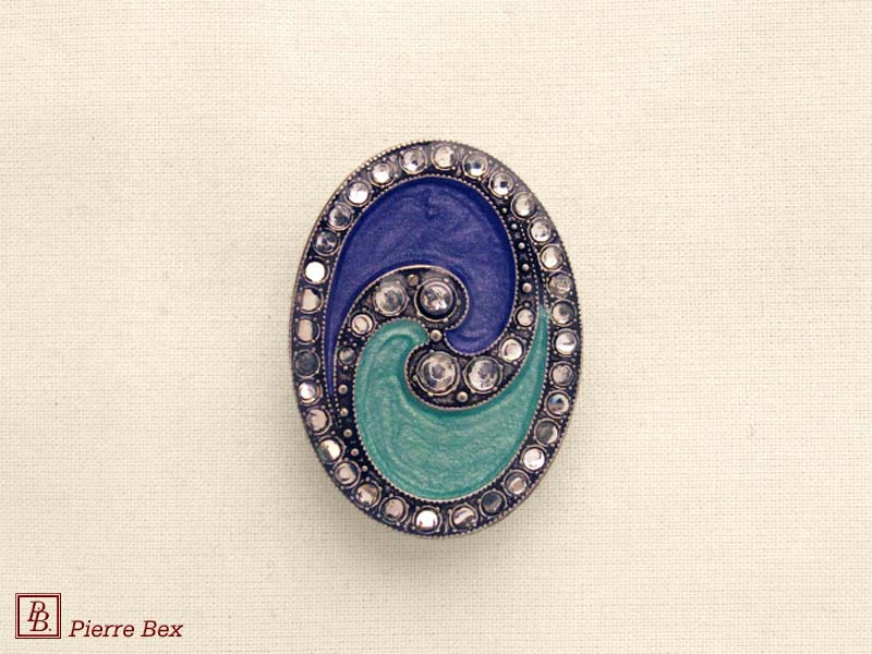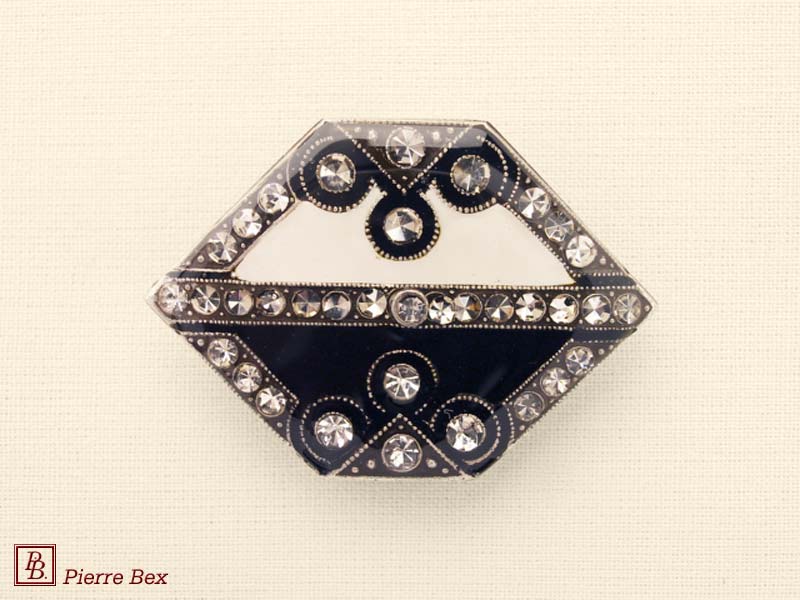 Sold OutMade by Pierre-Bex from silverplated copper, rhinestones and enamel, this scarf clip is 4 cm ( 1-½ inch ) width. Sold Out |