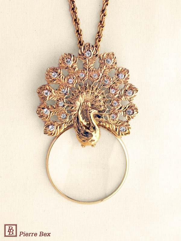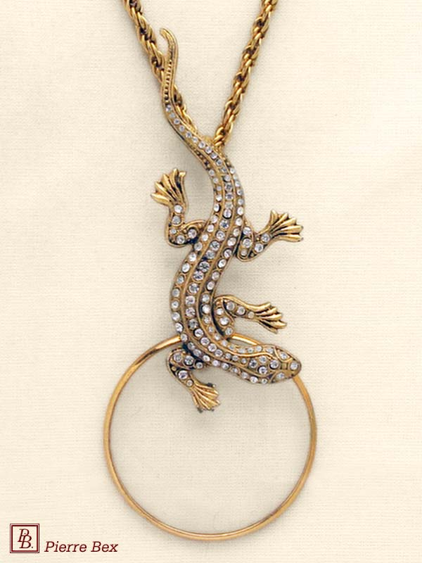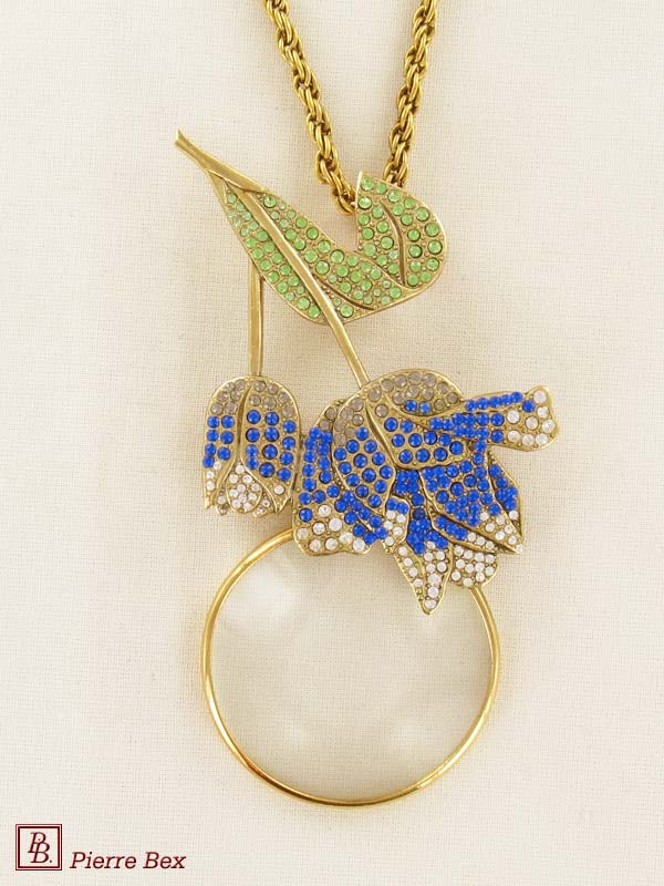 Made by Pierre-Bex from goldplated copper, rhinestones and enamel, this magnifying glass is 11 cm ( 4 inches ) height.