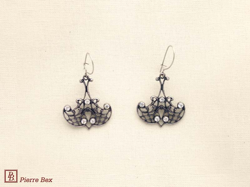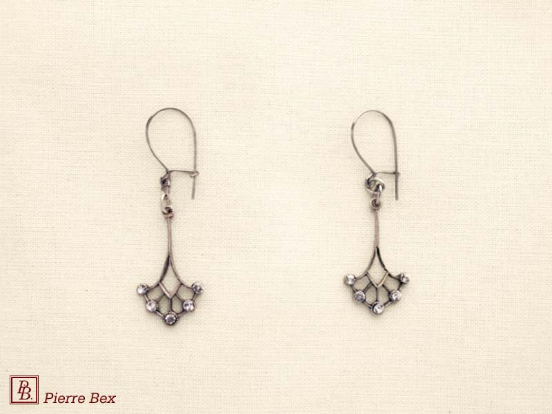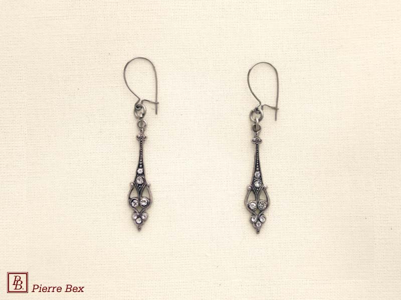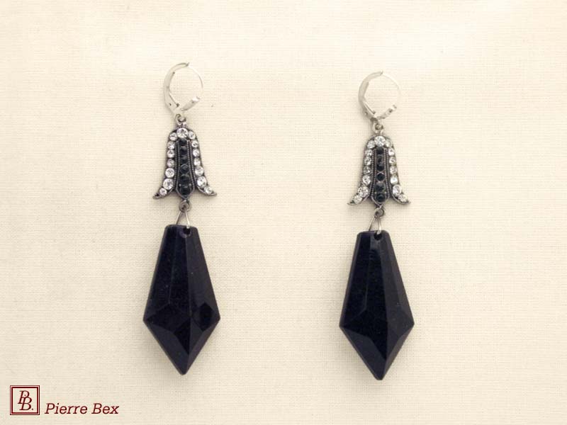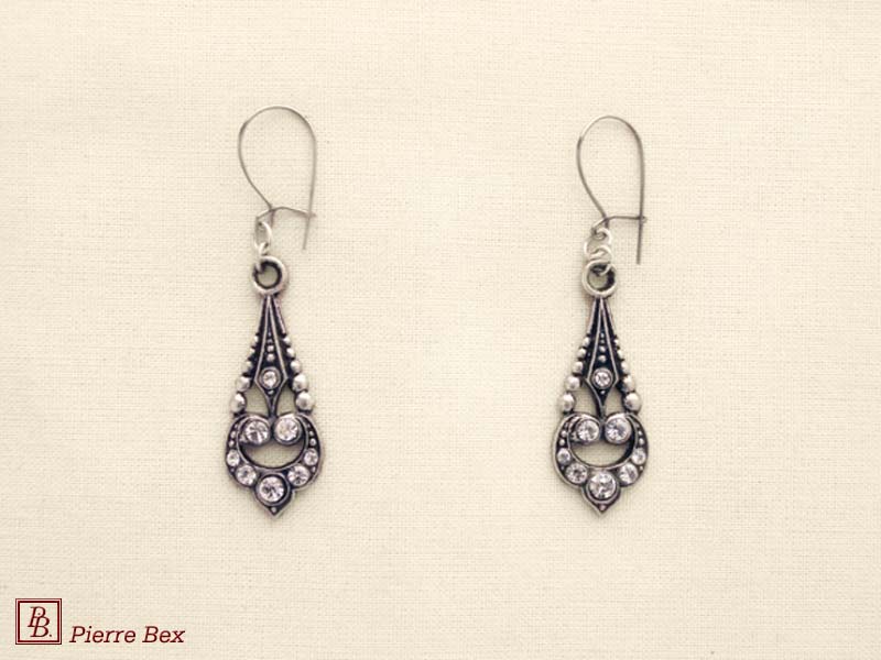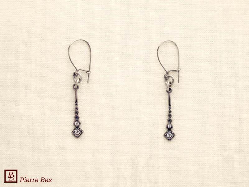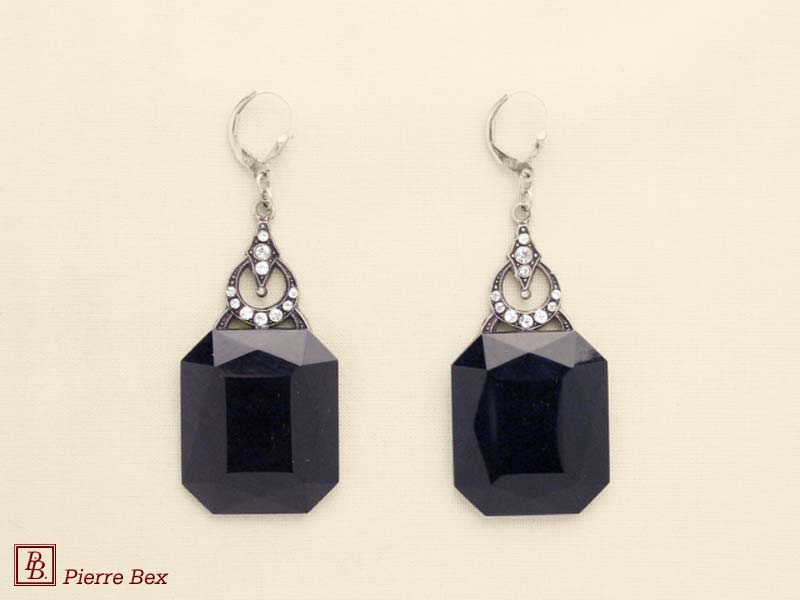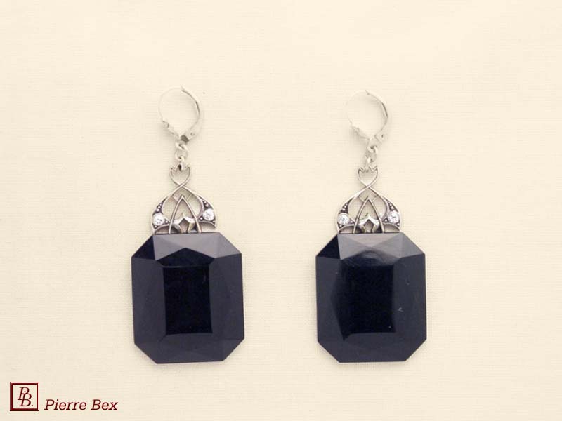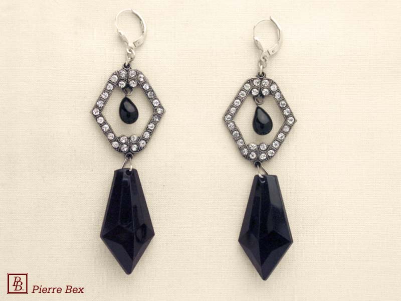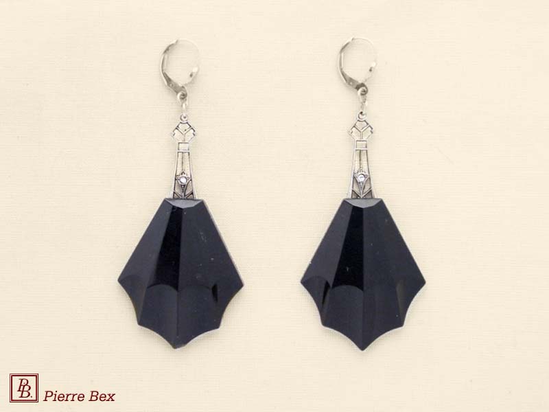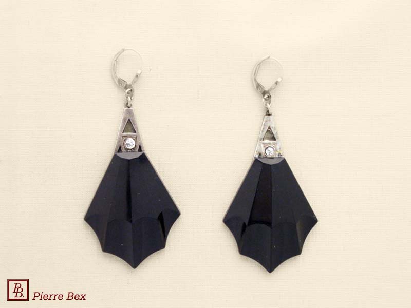 ![]() Art-Deco earrings 46145-15Sold OutMade by Pierre-Bex from silverplated copper and crystal rhinestones and a black crystal, they have a silver wire. The length of these earrings is 6.5 cm ( 2-½ inches ). Sold Out |