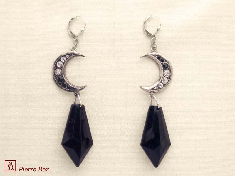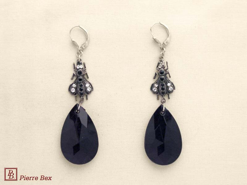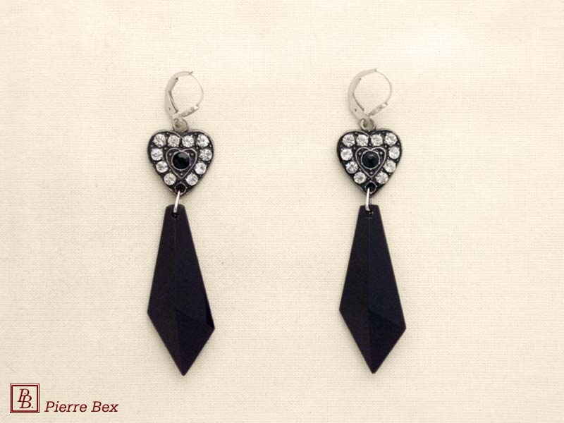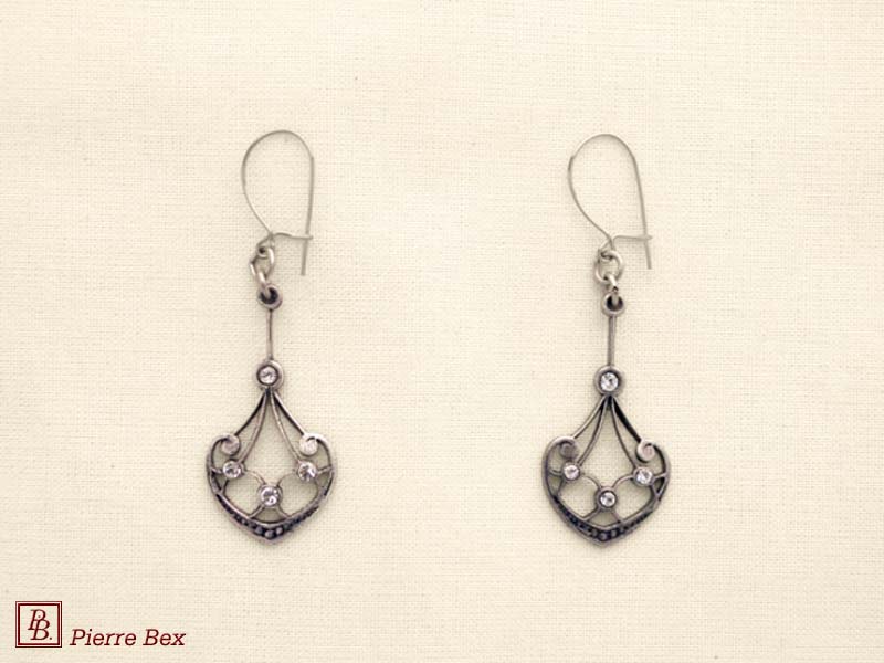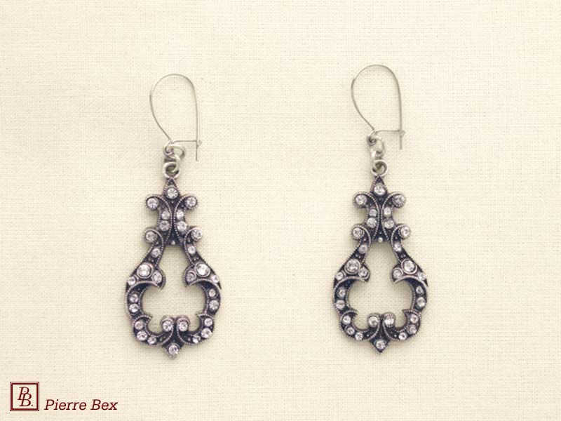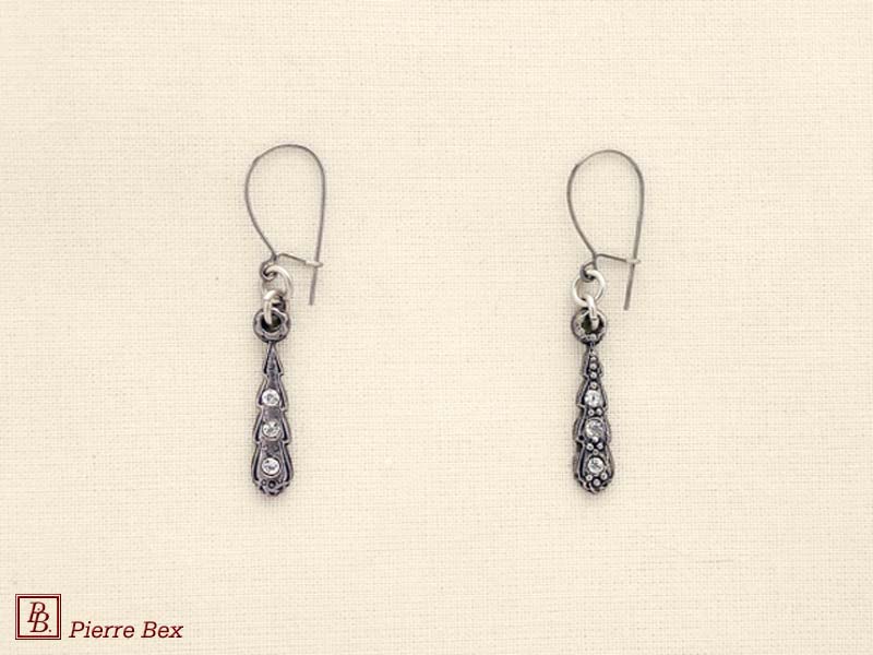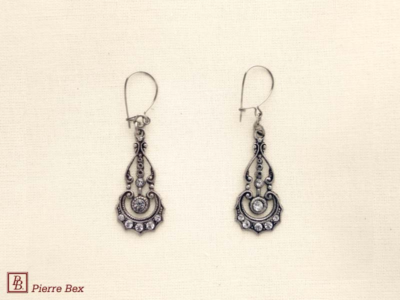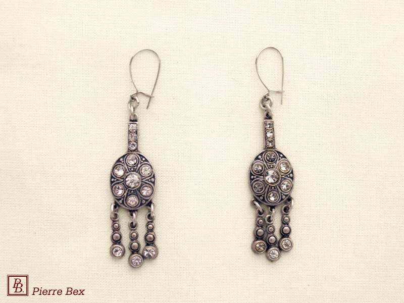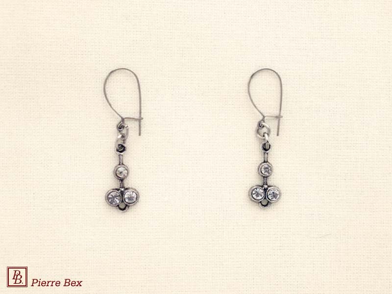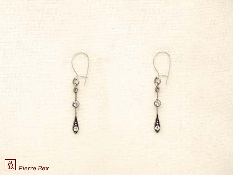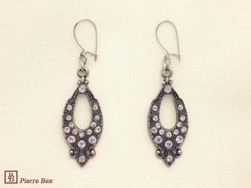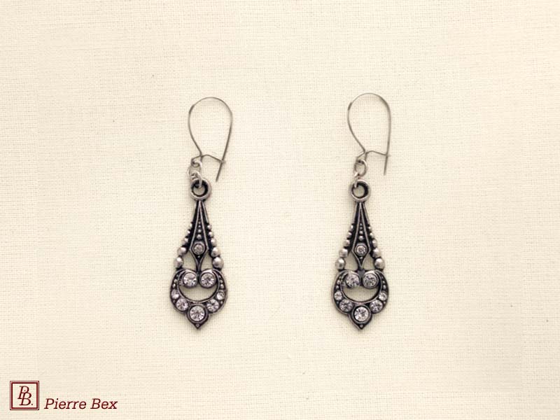 ![]() Art-Deco earrings 46145-15Sold OutMade by Pierre-Bex from silverplated copper and crystal rhinestones and a black crystal, they have a silver wire. The length of these earrings is 6.5 cm ( 2-½ inches ). Sold Out |