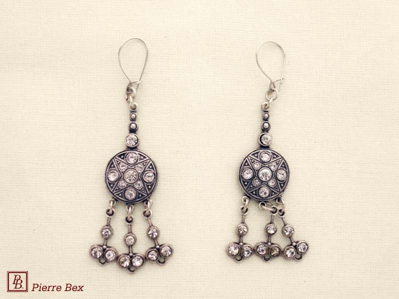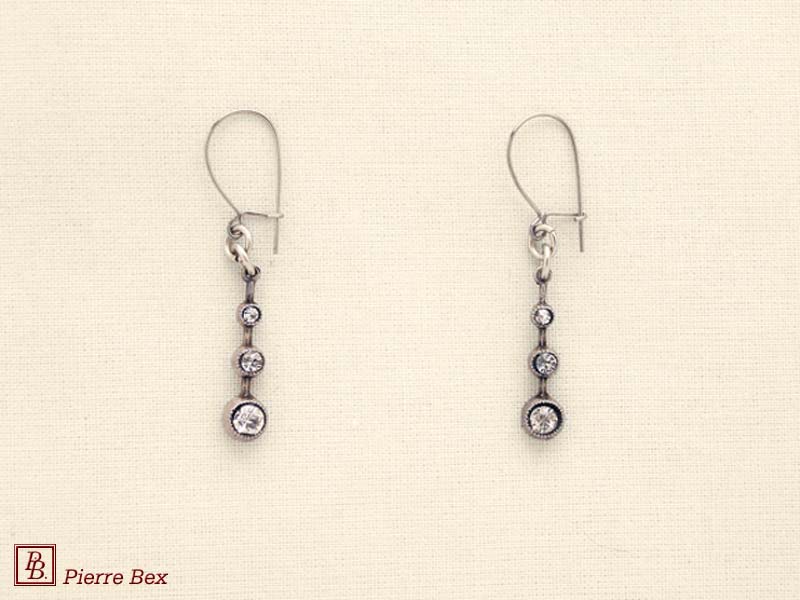 ![]() Art-Deco earrings 46145-12Sold OutMade by Pierre-Bex from silverplated copper and crystal rhinestones and a black crystal, they have a silver wire. The length of these earrings is 6.5 cm ( 2-½ inches ). Sold Out |
