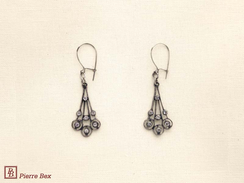 ![]() Art-Deco earrings with rhinestones 45555-13USD 35.00![]() Made by Pierre-Bex from silverplated copper and black and white rhinestones, they have a silver wire. The length of these earrings is 10 cm ( 4 inches ). USD 35.00 |