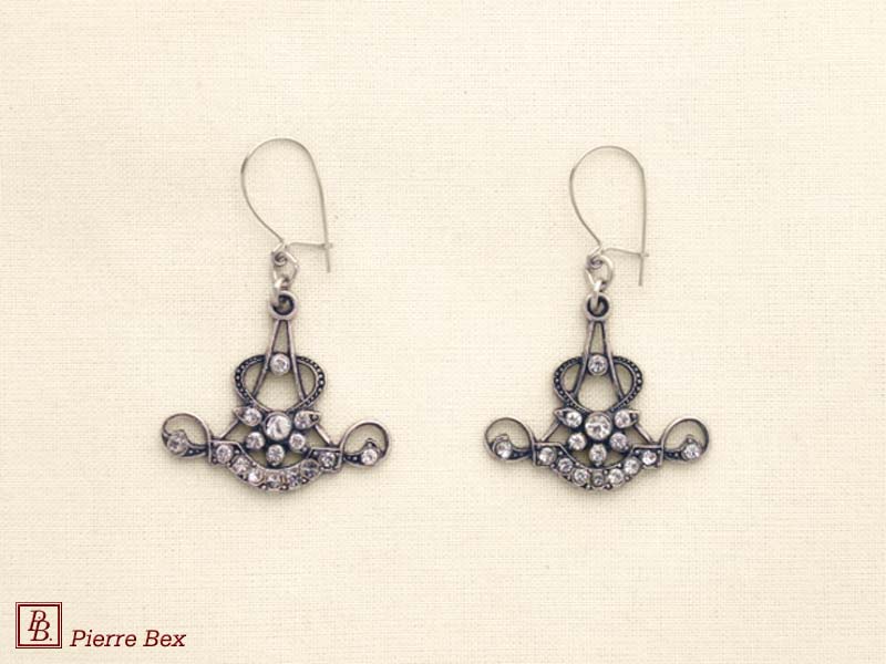 ![]() Art-Deco earrings 46145-01Sold OutMade by Pierre-Bex from silverplated copper and crystal rhinestones and a black crystal, they have a silver wire. The length of these earrings is 6.5 cm ( 2-½ inches ). Sold Out |